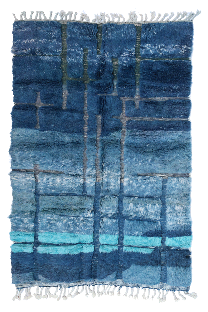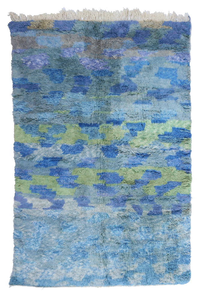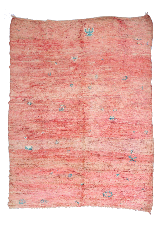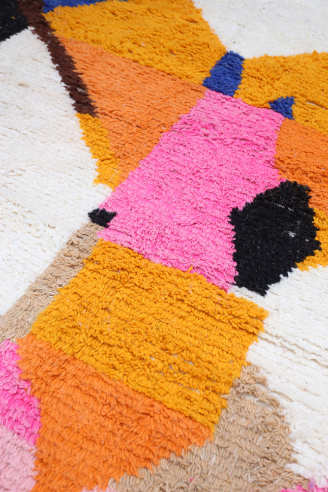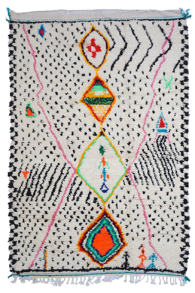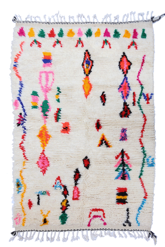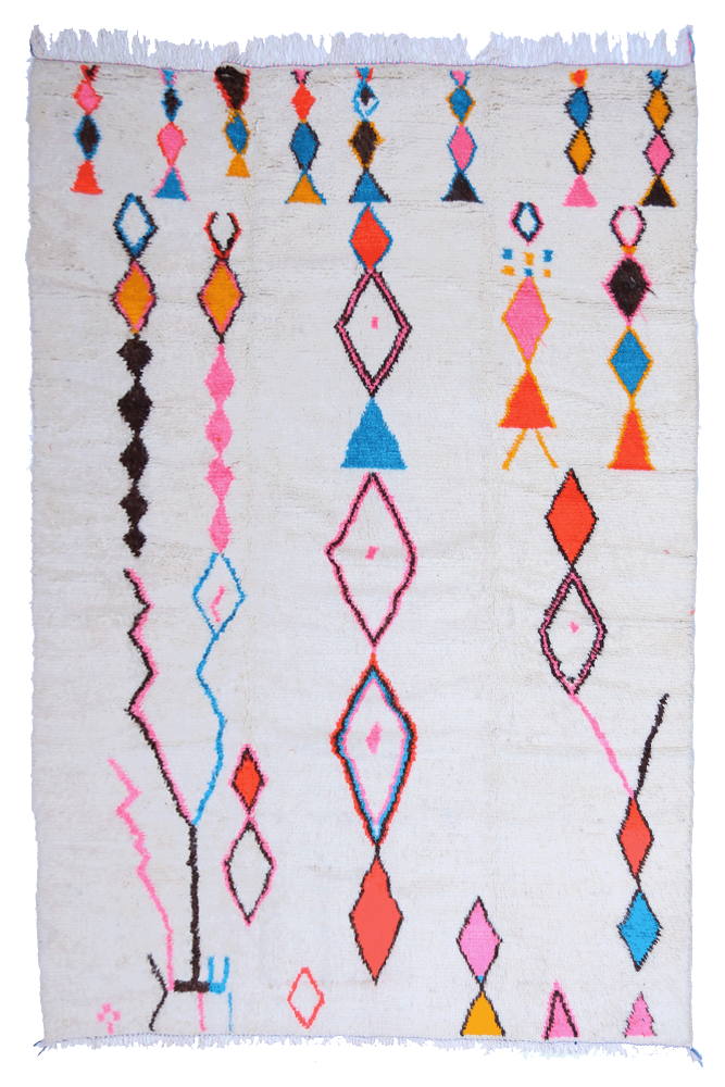 I'm sorry, but the text you provided is incomplete. Please provide the full text you would like me to translate from French to German. Azilal-Teppich Dieser Wollteppich aus Marokko stammt aus dem südlichen Marokko. Es handelt sich um Teppiche aus heller Wolle mit bunten und vielfältigen Mustern, die oft starke Symbole für den Stamm oder die berberische Weberin darstellen.