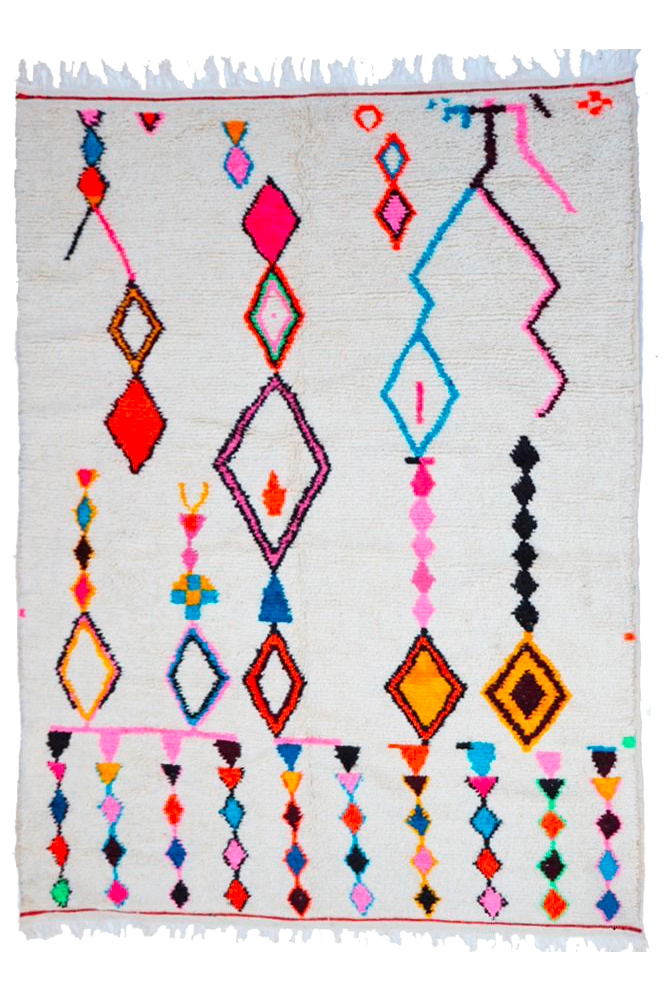 Der riesige Berber-Teppich ist mit Mustern, Zeichnungen und geometrischen Linien verziert. Diese Symbole repräsentieren die Geschichte der Stämme und/oder der Weberinnen. Wir sehen darin ein ästhetisches Design, aber es handelt sich in Wirklichkeit um eine Stammesschrift, die Botschaften wie Fruchtbarkeit, Familie, Schutz, Natur usw. trägt. Berberisches Rautenmuster-Teppich oder auch das Berberischer Teppich mit Punkten. Die meisten sind gebräuchlich, aber es gibt auch Symbole wie Winkeln, Zickzack-Muster und Dreiecke. Jeder marokkanische Teppich ist einzigartig und erzählt seine eigene Geschichte. Aber wenn Sie lieber einen Einfarbiger Berber-Teppich, Auf unserer Online-Boutique werden Sie ebenfalls fündig, mit großen Teppichen in einfarbigen Farben, um eine monochrome Dekoration zu harmonisieren oder im Gegenteil mit einem Colorblock-Effekt zu spielen. Zum Beispiel, ein großer Beiger Berber-Teppich kann durch das Hinzufügen einer Überlagerung eines kleinen Elements aufgehellt werden. Blauer Berberteppich oder eines kleinen Bunter Berber-Teppich. Einfarbige Modelle liegen auch voll im Trend.