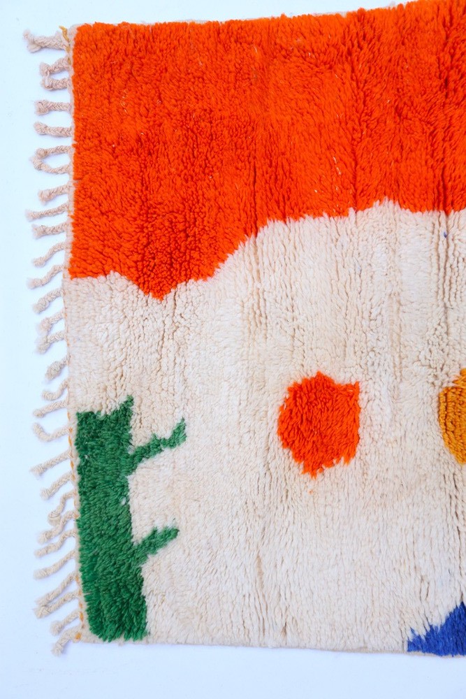Der sogenannte Azilal-Berber-Teppich, benannt nach der Region Azilal in Marokko, wo er auf einem traditionellen hölzernen Webstuhl von Hand gefertigt wurde. Seine Muster spiegeln die Stimmungen, Lieben und Leiden der Weberin zum Zeitpunkt seiner Entstehung wider. Nachdem dieser bunte Berber-Teppich hergestellt wurde, wird sie einen völlig anderen anfertigen, je nach ihren aktuellen Emotionen. Jedes Stück ist daher einzigartig.