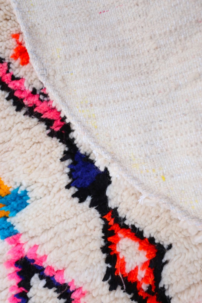 Dieser als Azilal bezeichnete Berber-Teppich hat seinen Namen von der Region Azilal in Marokko, wo er auf einem traditionellen hölzernen Webstuhl von Hand gefertigt wurde. Die Muster repräsentieren die Stimmungen, Lieben und Leiden der Weberin zum Zeitpunkt ihrer Herstellung. Nachdem dieser bunte Berber-Teppich erstellt wurde, wird sie einen völlig anderen anfertigen, je nach ihren aktuellen Emotionen. Jedes Stück ist also einzigartig.