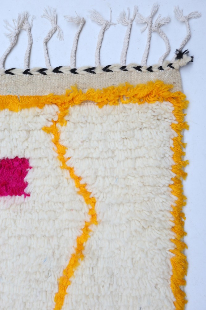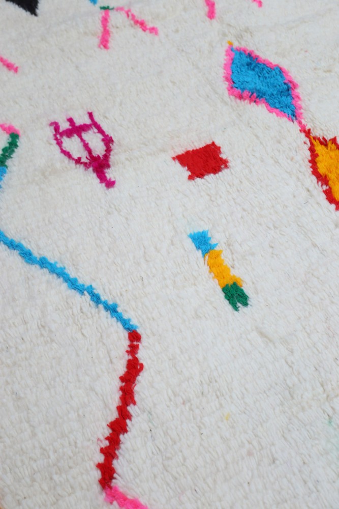 Dieser Berber-Teppich, genannt Azilal, hat seinen Namen von der Region Azilal in Marokko, wo er von Hand auf einem traditionellen hölzernen Webstuhl hergestellt wurde. Seine Muster spiegeln die Stimmungen, Lieben und Leiden der Weberin zum Zeitpunkt seiner Herstellung wider. Nachdem dieser bunte Berber-Teppich geschaffen wurde, wird sie einen völlig anderen anfertigen, je nach ihren aktuellen Emotionen. Jedes Stück ist also ein Unikat.