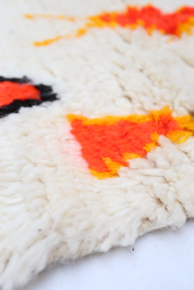 Dieser Berber-Teppich, genannt Azilal, hat seinen Namen von der Region Azilal in Marokko, wo er von Hand auf einem traditionellen hölzernen Webstuhl hergestellt wurde. Seine Muster spiegeln die Stimmungen, Lieben und Leiden der Weberin zum Zeitpunkt seiner Herstellung wider. Nachdem dieser bunte Berber-Teppich geschaffen wurde, wird sie einen völlig anderen anfertigen, je nach ihren aktuellen Emotionen. Jedes Stück ist also ein Unikat.