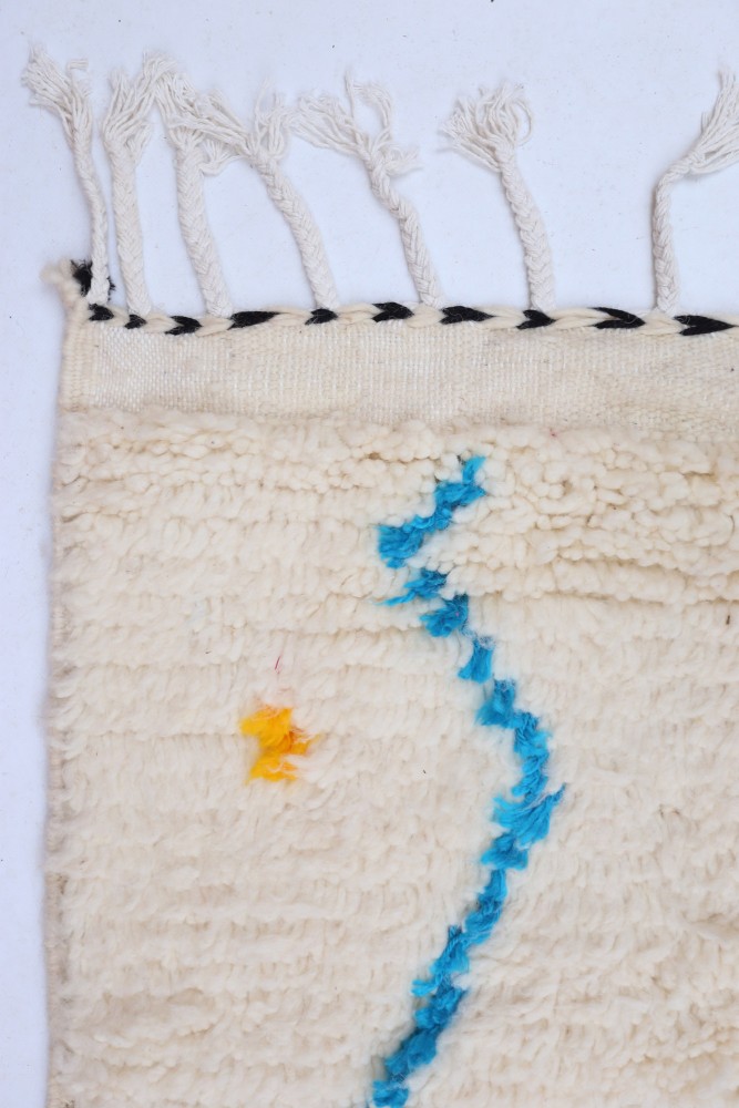 Dieser Berber-Teppich, genannt Azilal, hat seinen Namen von der Region Azilal in Marokko, wo er von Hand auf einem traditionellen hölzernen Webstuhl hergestellt wurde. Seine Muster spiegeln die Stimmungen, Lieben und Leiden der Weberin zum Zeitpunkt seiner Entstehung wider. Nach der Herstellung dieses farbenfrohen Berber-Teppichs wird sie einen völlig anderen anfertigen, je nach ihren aktuellen Emotionen. Jedes Stück ist somit ein Unikat.