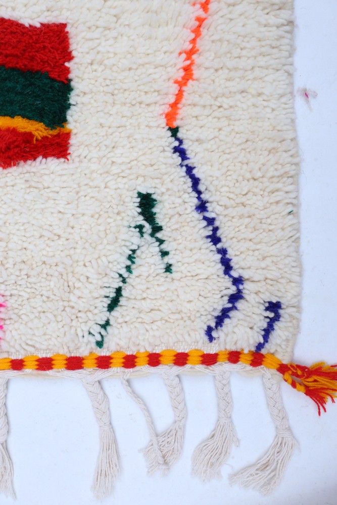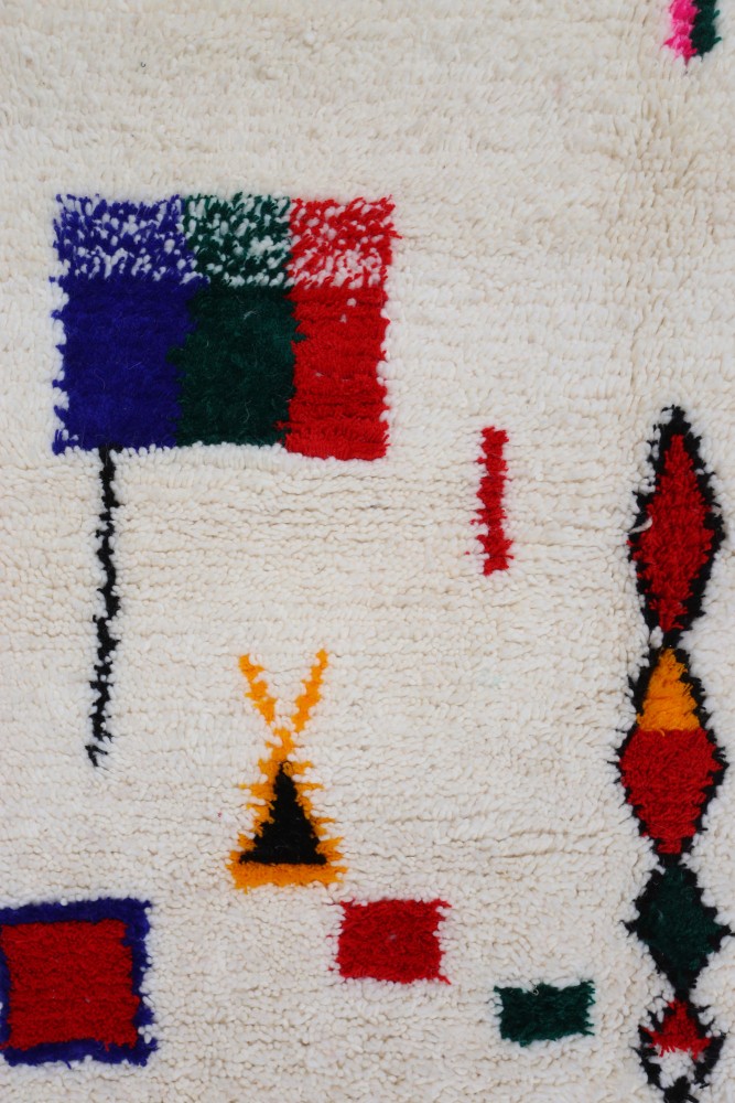 Dieser Berber-Teppich namens Azilal leitet seinen Namen von der Region Azilal in Marokko ab, wo er handgefertigt auf einem traditionellen hölzernen Webstuhl hergestellt wurde. Seine Muster spiegeln die Stimmungen, Lieben und Leiden der Weberin zum Zeitpunkt seiner Kreation wider. Nachdem dieser bunte Berber-Teppich erstellt wurde, wird sie einen völlig anderen Teppich anfertigen, abhängig von ihren aktuellen Emotionen. Jedes Stück ist daher einzigartig.