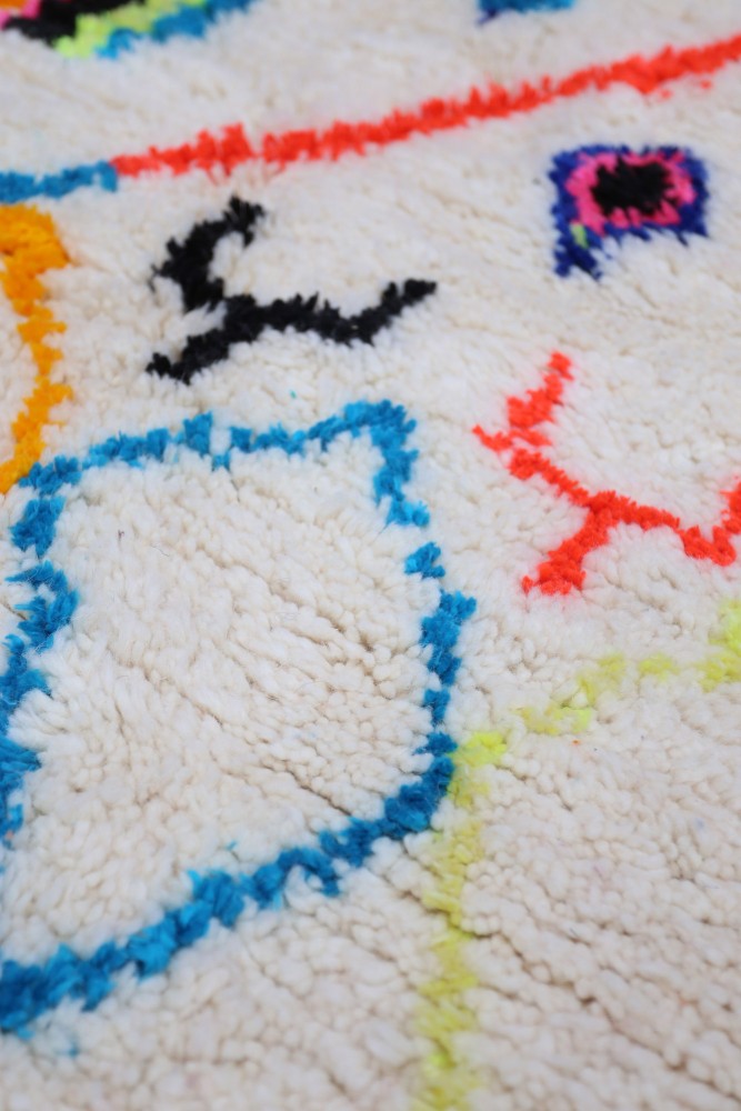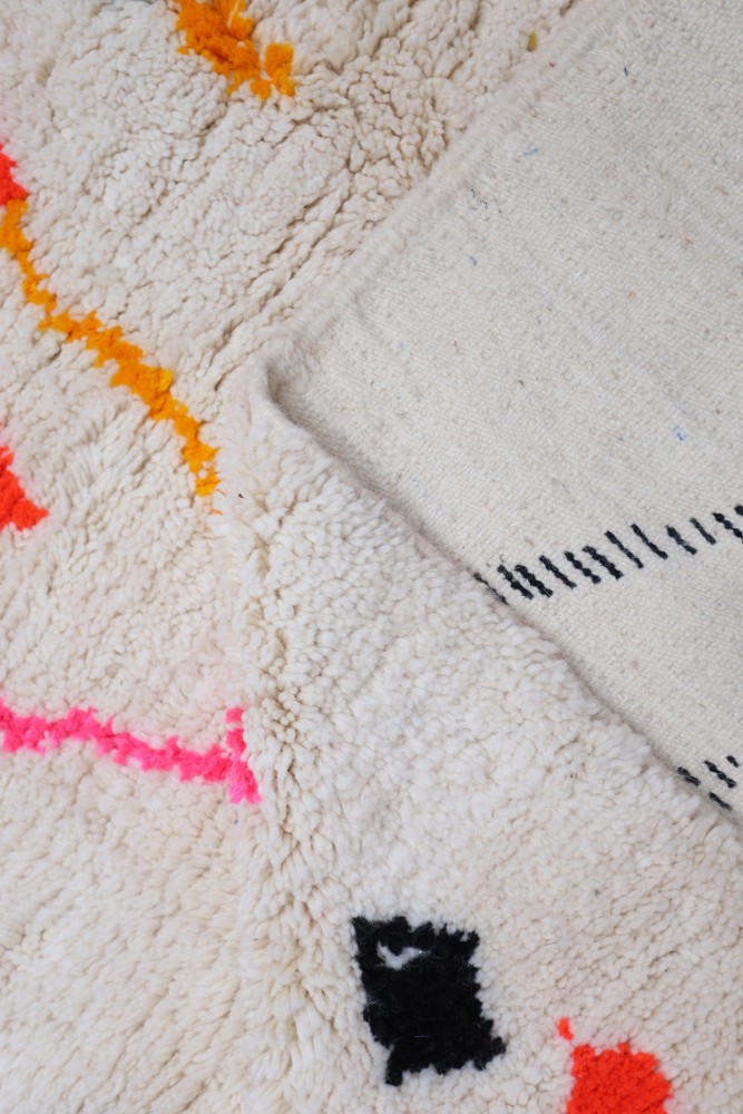 Dieser Berber-Teppich, genannt Azilal, stammt aus der Region Azilal in Marokko, wo er auf einem traditionellen hölzernen Webstuhl handgefertigt wurde. Seine Muster spiegeln die Stimmungen, Lieben und Leiden der Weberin zum Zeitpunkt seiner Entstehung wider. Nach der Erstellung dieses farbenfrohen Berber-Teppichs wird sie einen völlig anderen Teppich anfertigen, je nach ihren aktuellen Emotionen. Jedes Stück ist also einzigartig.