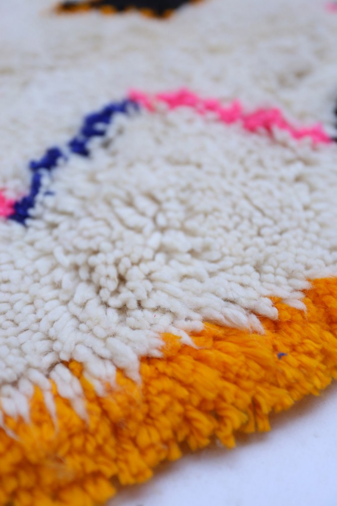 Dieser Berber-Teppich, genannt Azilal, stammt aus der Region Azilal in Marokko, wo er auf einem traditionellen hölzernen Webstuhl handgefertigt wurde. Seine Muster spiegeln die Stimmungen, Lieben und Leiden der Weberin zum Zeitpunkt seiner Entstehung wider. Nach der Erstellung dieses farbenfrohen Berber-Teppichs wird sie einen völlig anderen Teppich anfertigen, je nach ihren aktuellen Emotionen. Jedes Stück ist also einzigartig.