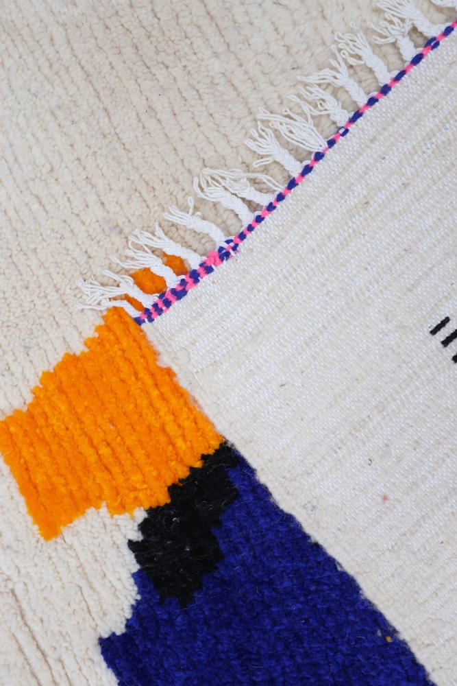 Dieser Berber-Teppich, genannt Azilal, hat seinen Namen von der Region Azilal in Marokko, wo er von Hand auf einem traditionellen hölzernen Webstuhl hergestellt wurde. Seine Muster spiegeln die Stimmungen, Lieben und Leiden der Weberin zum Zeitpunkt seiner Entstehung wider. Nachdem dieser bunte Berber-Teppich hergestellt wurde, wird sie einen völlig anderen Teppich herstellen, abhängig von ihren aktuellen Emotionen. Jedes Stück ist daher einzigartig.