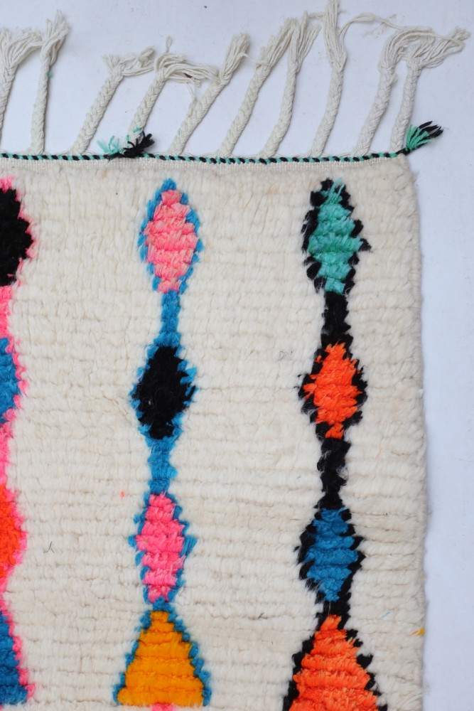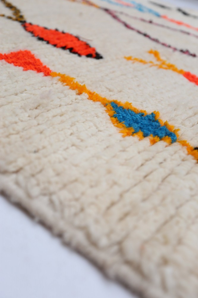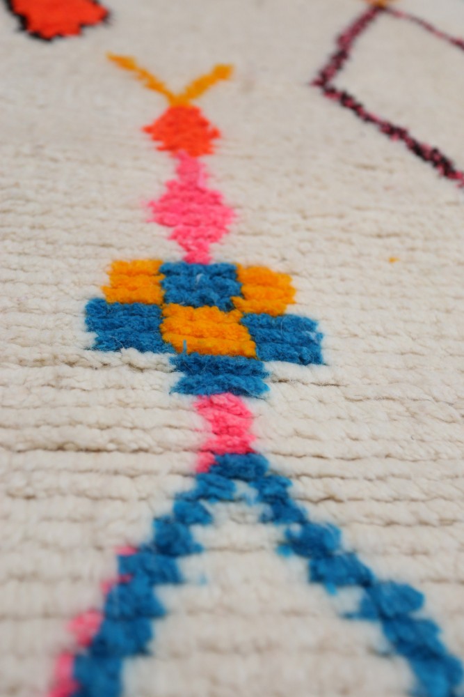 Ce tapis berbère que l'on appelle Azilal tient son nom de la région d'Azilal au Maroc où il a été confectionné à la main sur un métier à tisser traditionnel en bois. Ses motifs représentent les humeurs, les amours, les peines de la tisseuse au moment de sa création. Une fois ce tapis berbère coloré créé, elle en confectionnera un autre totalement différent, en fonction de ses émotions du moment. Chaque pièce est donc unique.