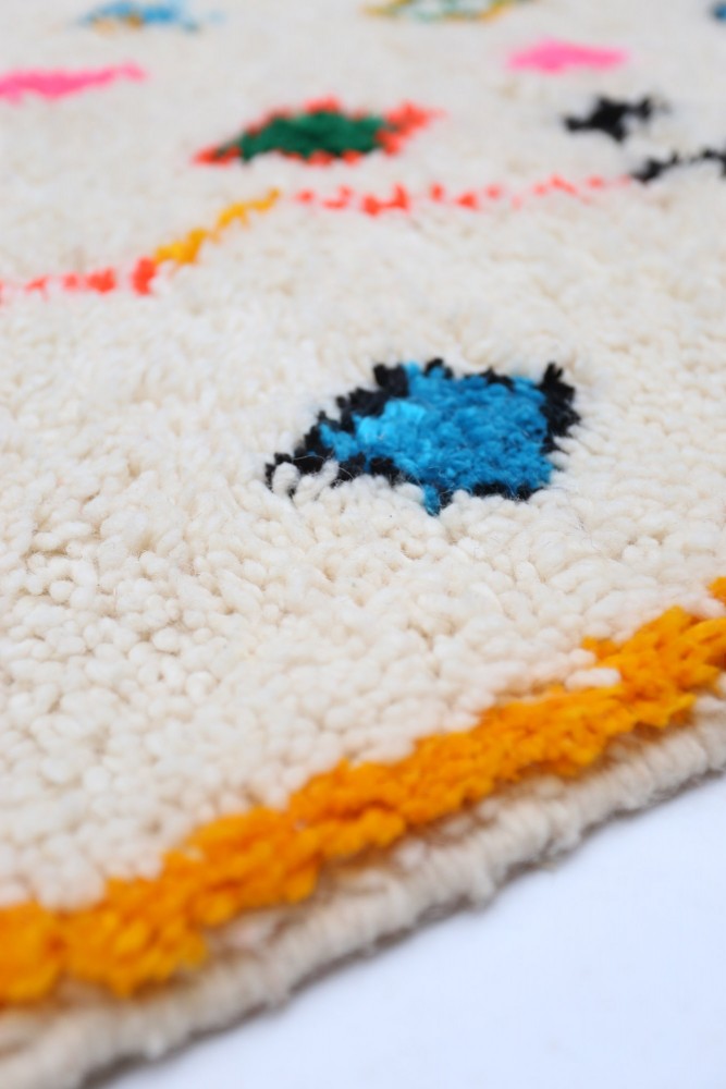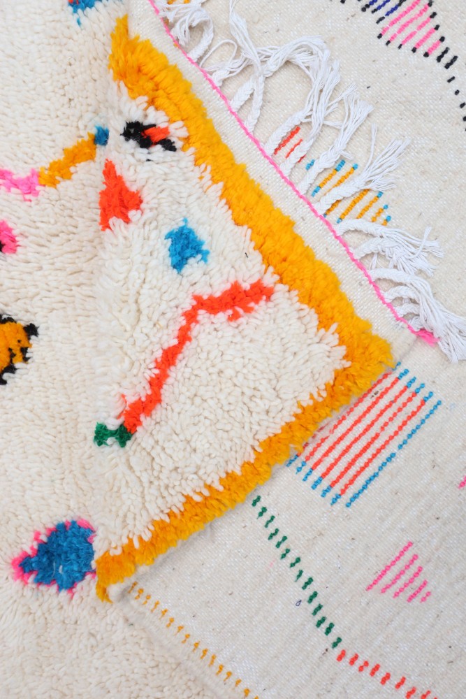 Dieser Berber-Teppich, genannt Azilal, hat seinen Namen von der Region Azilal in Marokko, wo er von Hand auf einem traditionellen hölzernen Webstuhl hergestellt wurde. Seine Muster spiegeln die Stimmungen, Lieben und Leiden der Weberin zum Zeitpunkt seiner Entstehung wider. Nachdem dieser bunte Berber-Teppich hergestellt wurde, wird sie einen völlig anderen Teppich herstellen, abhängig von ihren aktuellen Emotionen. Jedes Stück ist daher einzigartig.