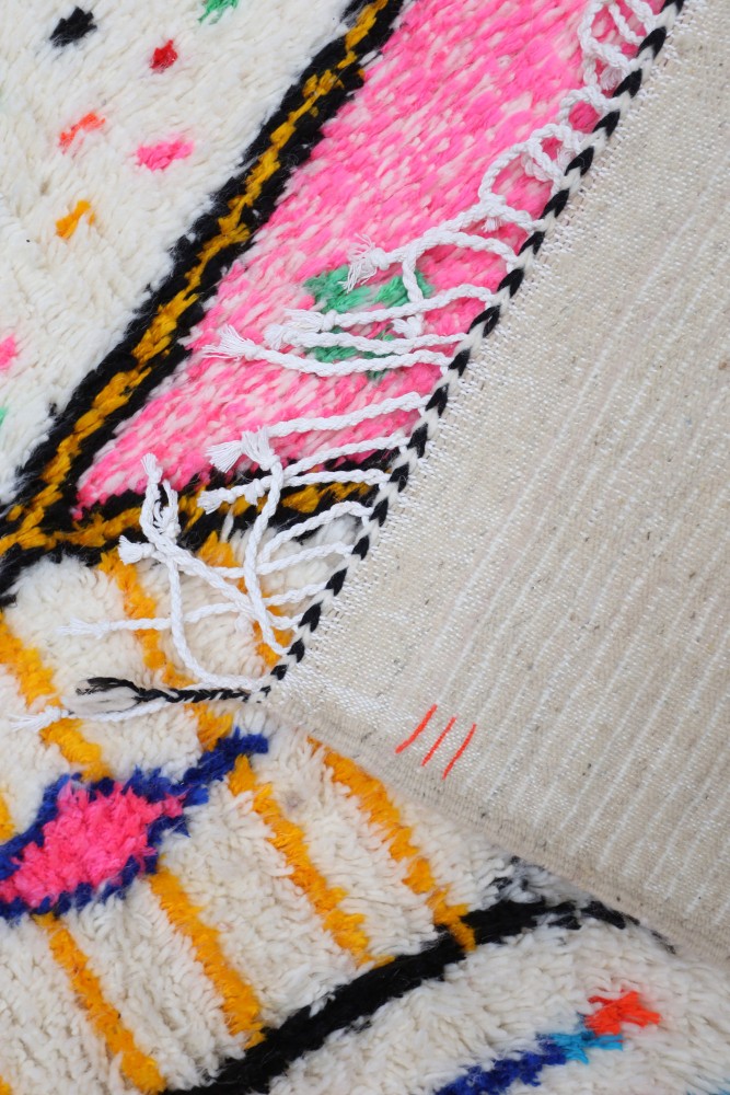 Dieser Berber-Teppich, genannt Azilal, hat seinen Namen von der Region Azilal in Marokko, wo er von Hand auf einem traditionellen hölzernen Webstuhl hergestellt wurde. Seine Muster spiegeln die Stimmungen, Lieben und Leiden der Weberin zum Zeitpunkt seiner Entstehung wider. Nachdem dieser bunte Berber-Teppich hergestellt wurde, wird sie einen völlig anderen Teppich herstellen, abhängig von ihren aktuellen Emotionen. Jedes Stück ist daher einzigartig.