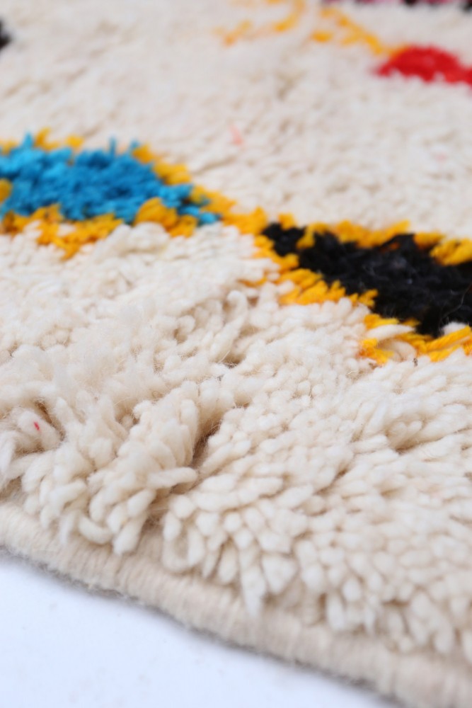 Dieser Berber-Teppich, genannt Azilal, hat seinen Namen von der Region Azilal in Marokko, wo er von Hand auf einem traditionellen hölzernen Webstuhl hergestellt wurde. Seine Muster spiegeln die Stimmungen, Lieben und Leiden der Weberin zum Zeitpunkt seiner Entstehung wider. Nachdem dieser bunte Berber-Teppich hergestellt wurde, wird sie einen völlig anderen Teppich herstellen, abhängig von ihren aktuellen Emotionen. Jedes Stück ist daher einzigartig.