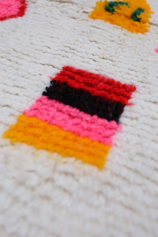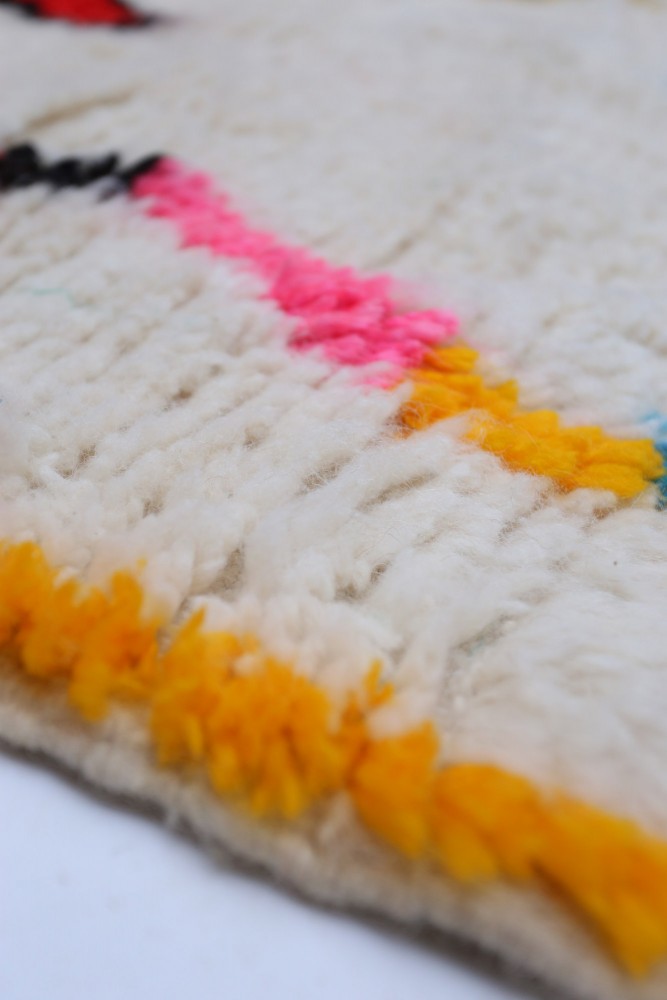 Dieser Berber-Teppich, genannt Azilal, hat seinen Namen von der Region Azilal in Marokko, wo er von Hand auf einem traditionellen hölzernen Webstuhl hergestellt wurde. Seine Muster spiegeln die Stimmungen, Lieben und Leiden der Weberin zum Zeitpunkt seiner Entstehung wider. Nachdem dieser bunte Berber-Teppich hergestellt wurde, wird sie einen völlig anderen Teppich herstellen, abhängig von ihren aktuellen Emotionen. Jedes Stück ist daher einzigartig.