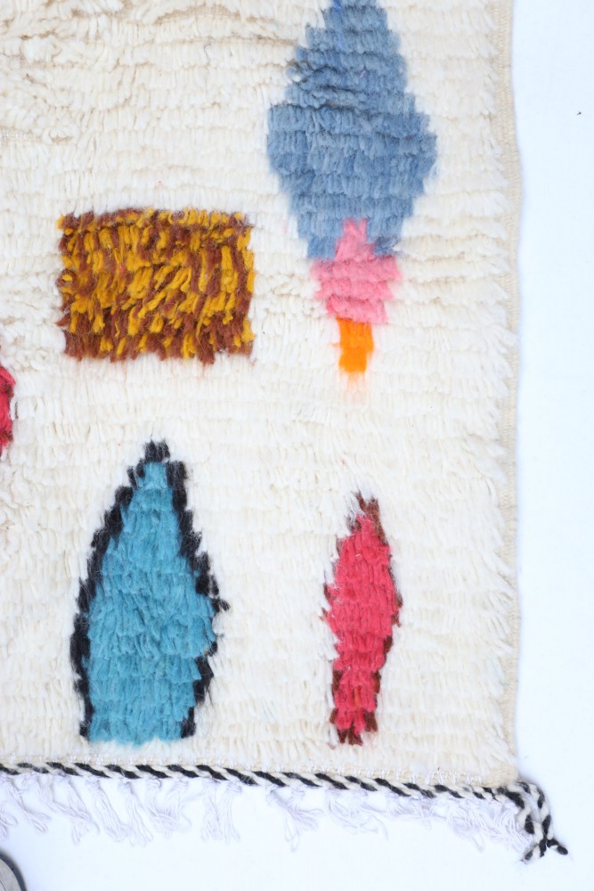 Dieser Berber-Teppich, genannt Azilal, hat seinen Namen von der Region Azilal in Marokko, wo er von Hand auf einem traditionellen hölzernen Webstuhl hergestellt wurde. Seine Muster spiegeln die Stimmungen, Lieben und Leiden der Weberin zum Zeitpunkt seiner Entstehung wider. Nachdem dieser bunte Berber-Teppich hergestellt wurde, wird sie einen völlig anderen Teppich herstellen, abhängig von ihren aktuellen Emotionen. Jedes Stück ist daher einzigartig.