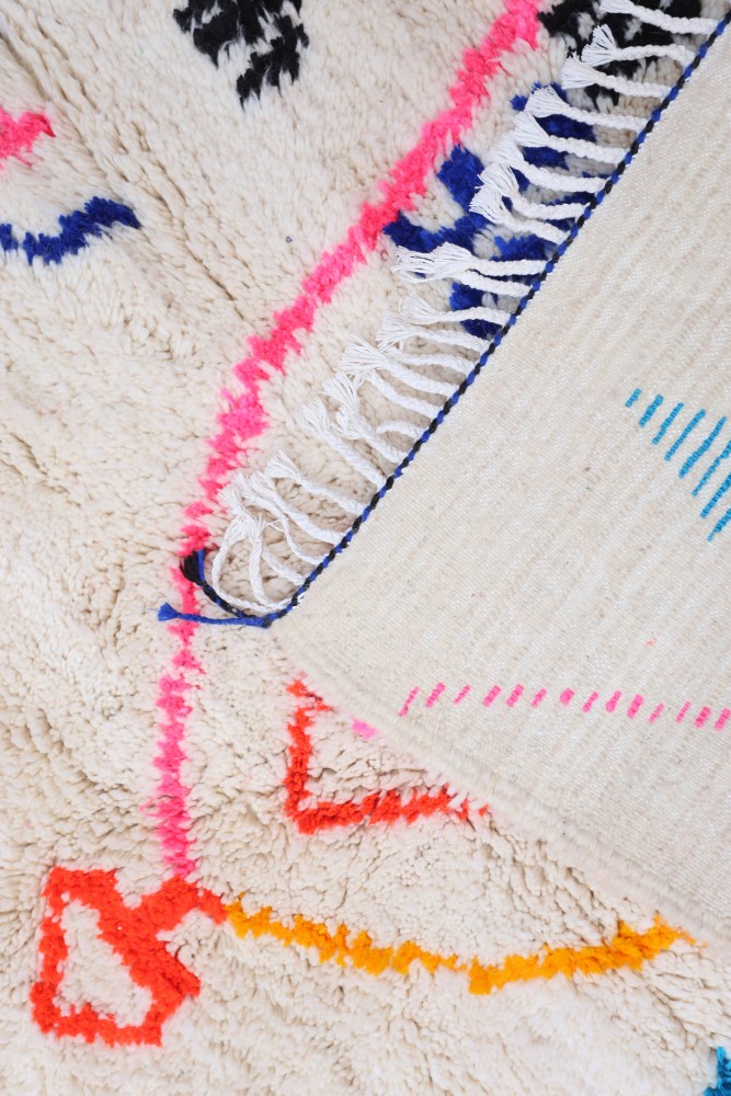 Der so genannte Azilal-Berber-Teppich wurde nach der Region Azilal in Marokko benannt, wo er von Hand an einem traditionellen Holzwebstuhl hergestellt wurde. Seine Muster repräsentieren die Stimmungen, Lieben und Leiden der Weberin zum Zeitpunkt seiner Erstellung. Nachdem dieser bunte Berber-Teppich geschaffen wurde, wird sie einen völlig anderen Teppich anfertigen, abhängig von ihren aktuellen Emotionen. Jedes Stück ist also einzigartig.