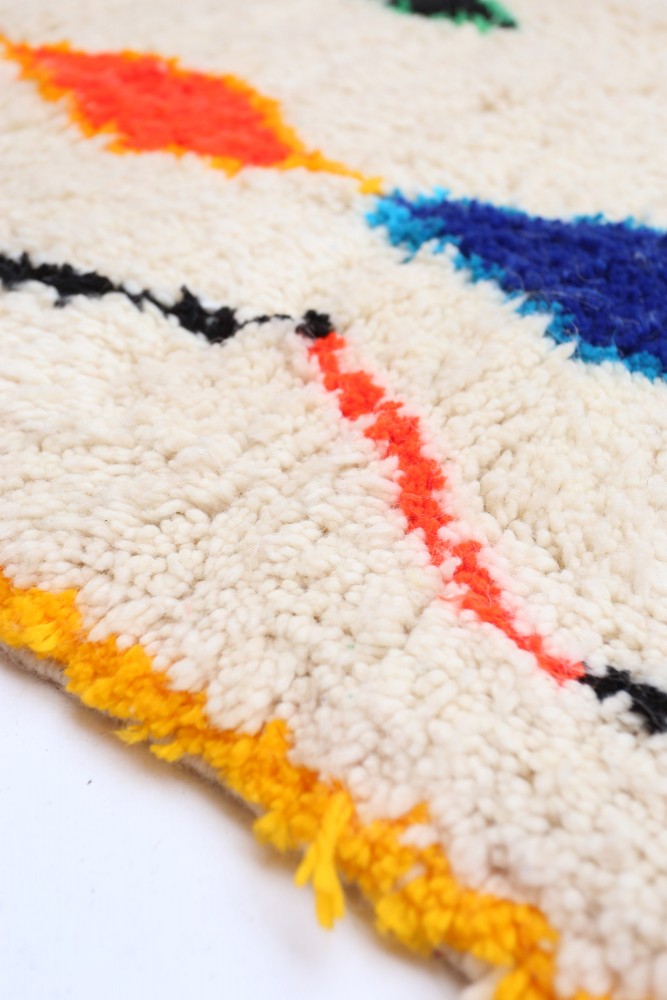 Der so genannte Azilal-Berber-Teppich wurde nach der Region Azilal in Marokko benannt, wo er von Hand an einem traditionellen Holzwebstuhl hergestellt wurde. Seine Muster repräsentieren die Stimmungen, Lieben und Leiden der Weberin zum Zeitpunkt seiner Erstellung. Nachdem dieser bunte Berber-Teppich geschaffen wurde, wird sie einen völlig anderen Teppich anfertigen, abhängig von ihren aktuellen Emotionen. Jedes Stück ist also einzigartig.