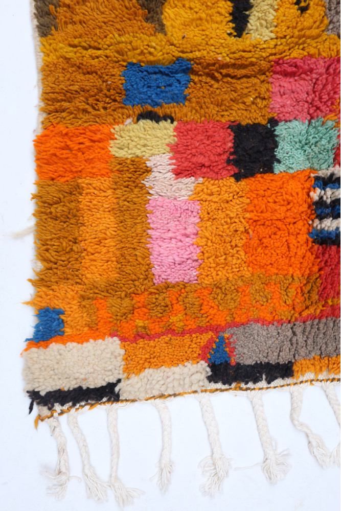 Dieser Berber-Teppich, genannt Azilal, hat seinen Namen von der Region Azilal in Marokko, wo er von Hand auf einem traditionellen hölzernen Webstuhl hergestellt wurde. Seine Muster spiegeln die Stimmungen, Lieben und Leiden der Weberin zum Zeitpunkt seiner Entstehung wider. Nachdem dieser bunte Berber-Teppich fertiggestellt ist, wird sie einen völlig anderen herstellen, je nach ihren aktuellen Emotionen. Jedes Stück ist also einzigartig.