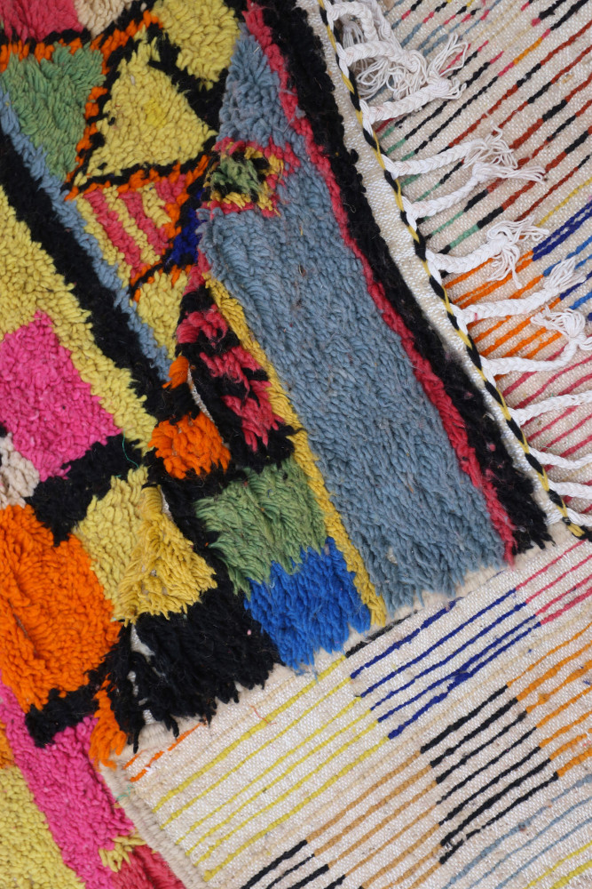 Dieser Berber-Teppich, genannt Azilal, hat seinen Namen von der Region Azilal in Marokko, wo er von Hand auf einem traditionellen hölzernen Webstuhl hergestellt wurde. Seine Muster spiegeln die Stimmungen, Lieben und Leiden der Weberin zum Zeitpunkt seiner Entstehung wider. Nachdem dieser bunte Berber-Teppich fertiggestellt ist, wird sie einen völlig anderen herstellen, je nach ihren aktuellen Emotionen. Jedes Stück ist also einzigartig.