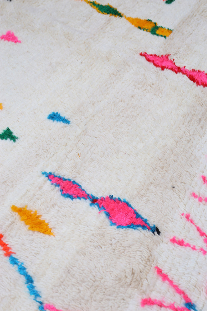 Dieser Berber-Teppich, genannt Azilal, hat seinen Namen von der Region Azilal in Marokko, wo er von Hand auf einem traditionellen hölzernen Webstuhl hergestellt wurde. Seine Muster spiegeln die Stimmungen, Lieben und Leiden der Weberin zum Zeitpunkt seiner Entstehung wider. Nachdem dieser bunte Berber-Teppich fertiggestellt ist, wird sie einen völlig anderen herstellen, je nach ihren aktuellen Emotionen. Jedes Stück ist also einzigartig.