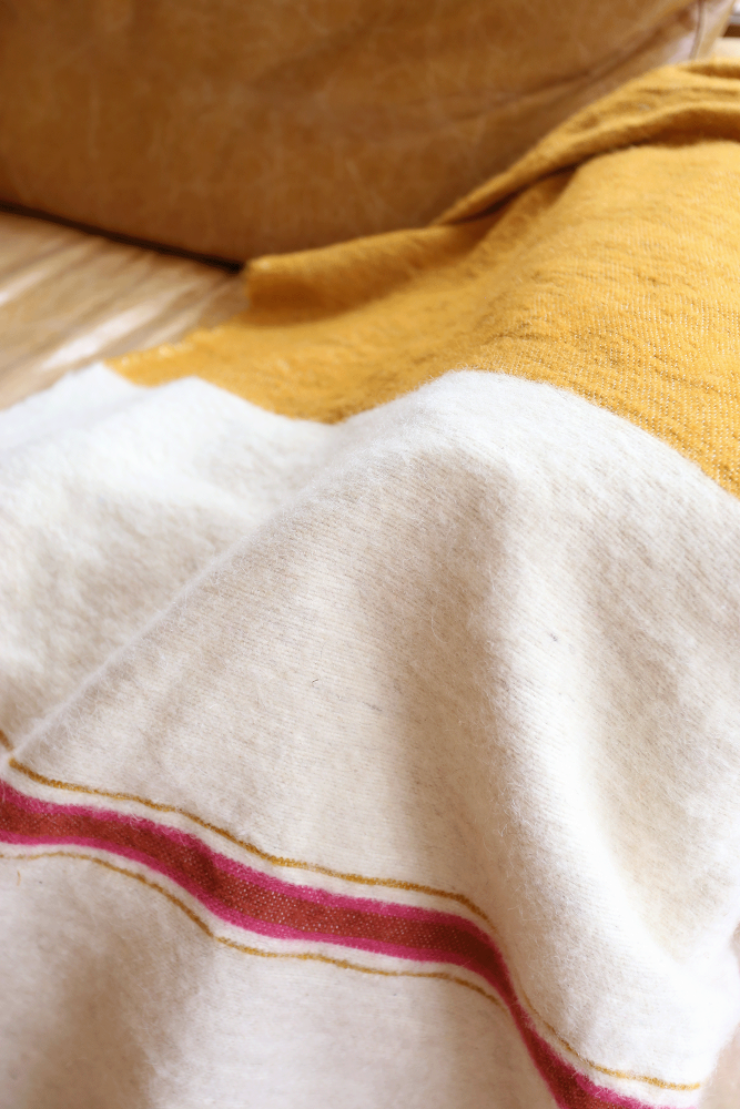 Zweifarbige Berber-Decke in Weiß und Gelb mit rosa Wollquasten, handgefertigt in Marokko.