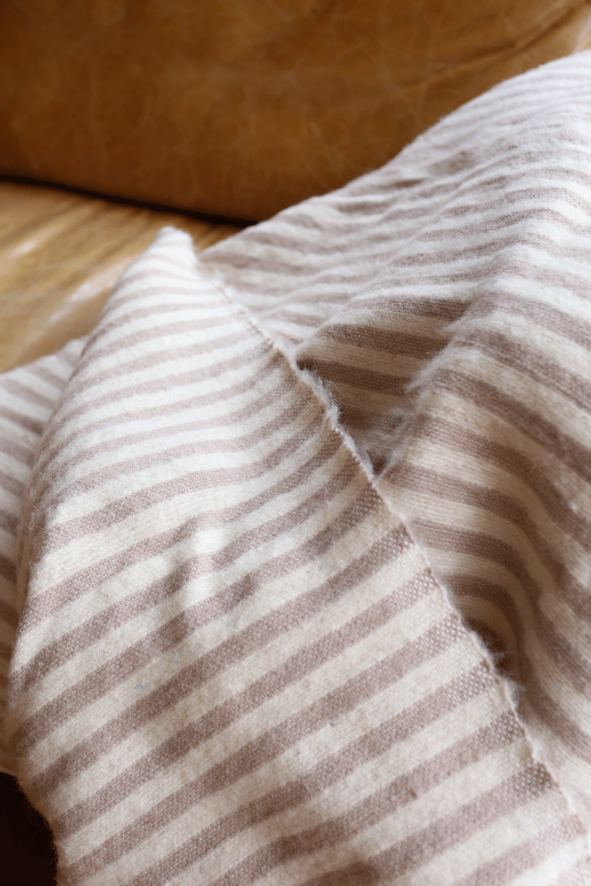 Berberischer Wolldecke mit taupefarbenen Streifen und Pompons -