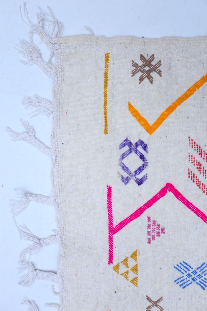 Dieser Berber-Teppich, genannt Azilal, hat seinen Namen von der Region Azilal in Marokko, wo er von Hand auf einem traditionellen hölzernen Webstuhl gefertigt wurde. Seine Muster spiegeln die Stimmungen, Lieben und Leiden der Weberin zum Zeitpunkt seiner Entstehung wider. Nachdem dieser bunte Berber-Teppich erstellt wurde, wird sie einen völlig anderen Teppich herstellen, je nach ihren aktuellen Emotionen. Jedes Stück ist daher einzigartig.