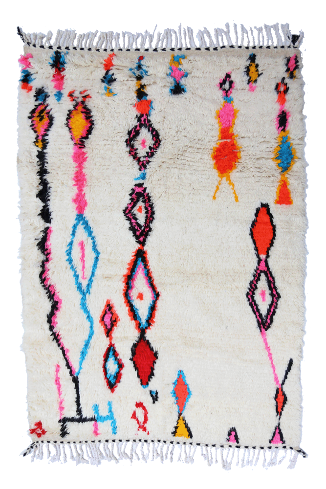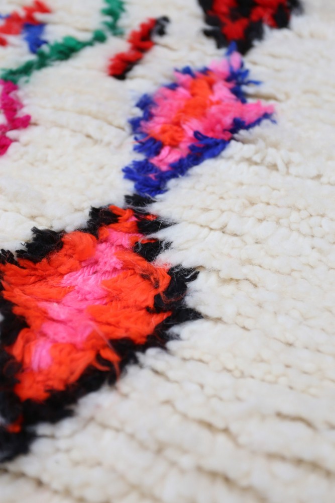 Comes from a tribe in the rocky and high region of Azilal, located in the High Atlas mountains. This red Berber carpet features numerous abstract motifs with several Berber symbols. This carpet, with long or short pile, highlights the color, often on a beige, white, or ecru background.You can find models that highlight the color red with geometric patterns symbolizing fertility, protection, nature, luck, or home.(the patterns will mainly be diamonds, there are fewer polka dot Berber carpets for the Azilal tribe). These Moroccan carpet designs are often associated withfluorescent Berber rugsBy their mixture of bright and shimmering colors.