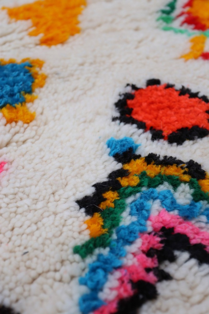 This Berber carpet, known as Azilal, gets its name from the Azilal region in Morocco where it was handmade on a traditional wooden loom. Its patterns represent the moods, loves, and sorrows of the weaver at the time of creation. Once this colorful Berber carpet is made, she will create another one totally different, based on her current emotions. Each piece is therefore unique.