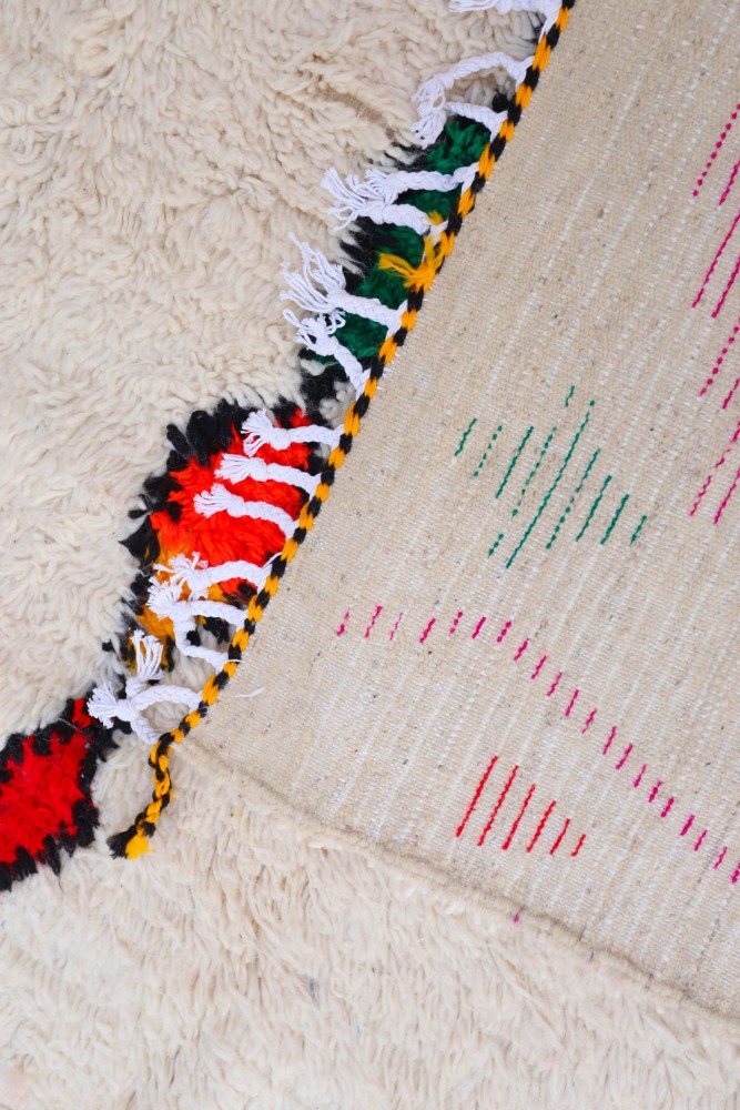 This Berber carpet called Azilal gets its name from the Azilal region in Morocco where it was handcrafted on a traditional wooden loom. Its patterns represent the weaver’s moods, loves, and sorrows at the time of creation. Once this colorful Berber carpet is created, she will make another one entirely different, based on her current emotions. Each piece is therefore unique.