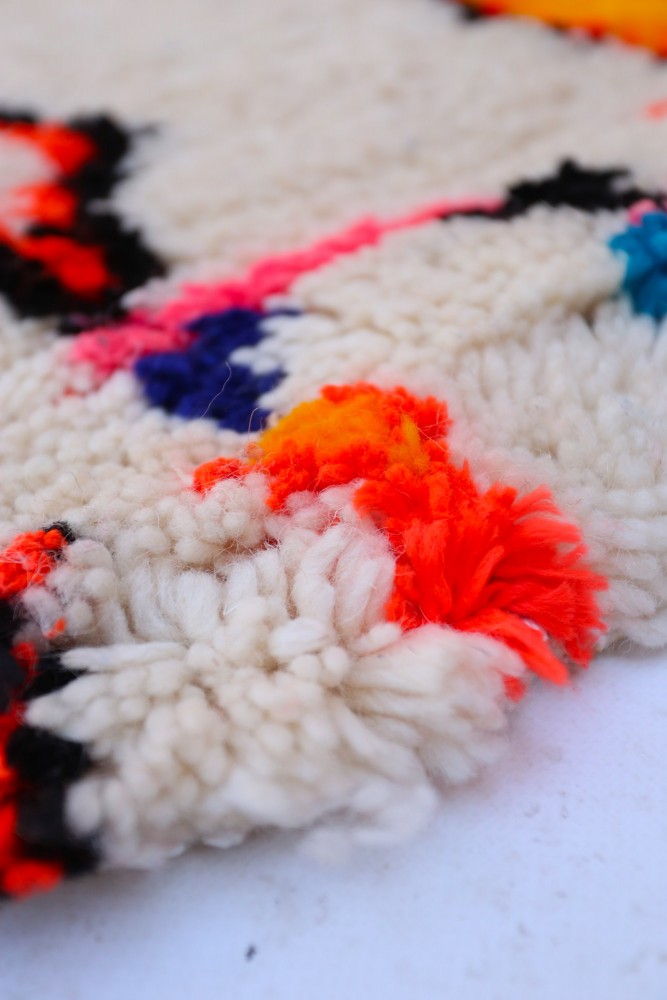 This Berber carpet called Azilal gets its name from the Azilal region in Morocco where it was handcrafted on a traditional wooden loom. Its patterns represent the weaver’s moods, loves, and sorrows at the time of creation. Once this colorful Berber carpet is created, she will make another one entirely different, based on her current emotions. Each piece is therefore unique.