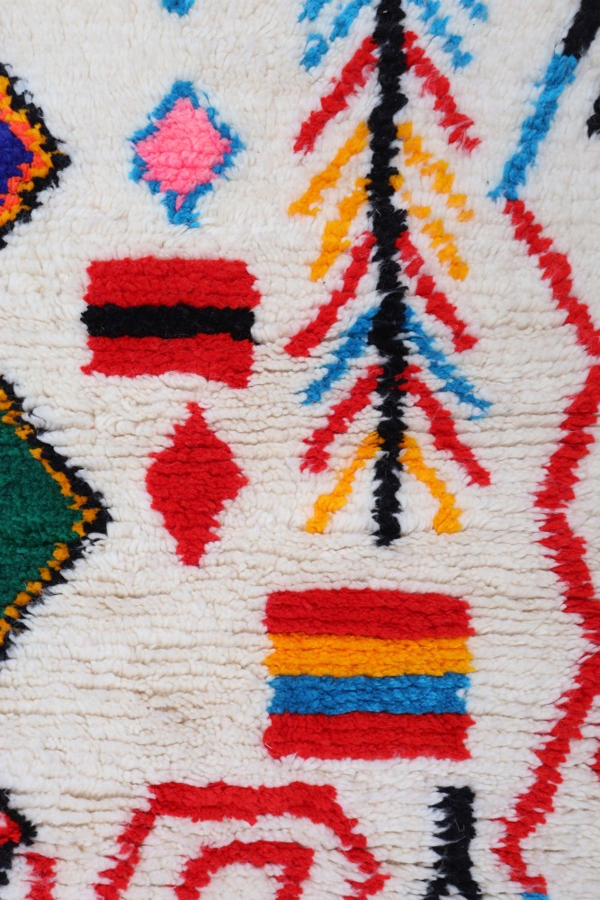 This Berber carpet called Azilal gets its name from the Azilal region in Morocco where it was handcrafted on a traditional wooden loom. Its patterns represent the weaver’s moods, loves, and sorrows at the time of creation. Once this colorful Berber carpet is created, she will make another one entirely different, based on her current emotions. Each piece is therefore unique.