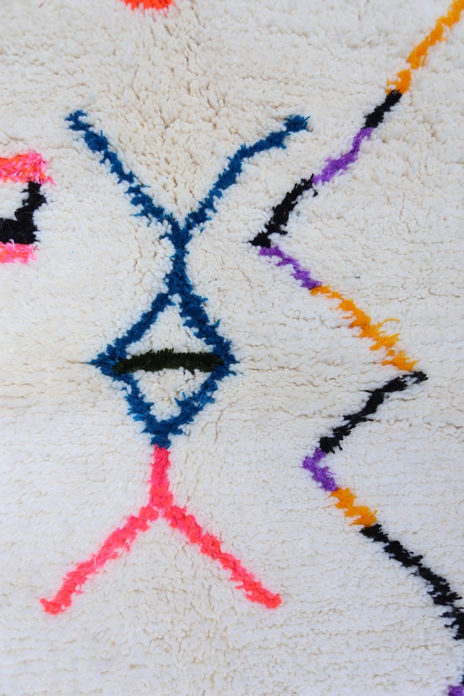This Berber carpet called Azilal gets its name from the Azilal region in Morocco where it was handcrafted on a traditional wooden loom. Its patterns represent the weaver’s moods, loves, and sorrows at the time of creation. Once this colorful Berber carpet is created, she will make another one entirely different, based on her current emotions. Each piece is therefore unique.
