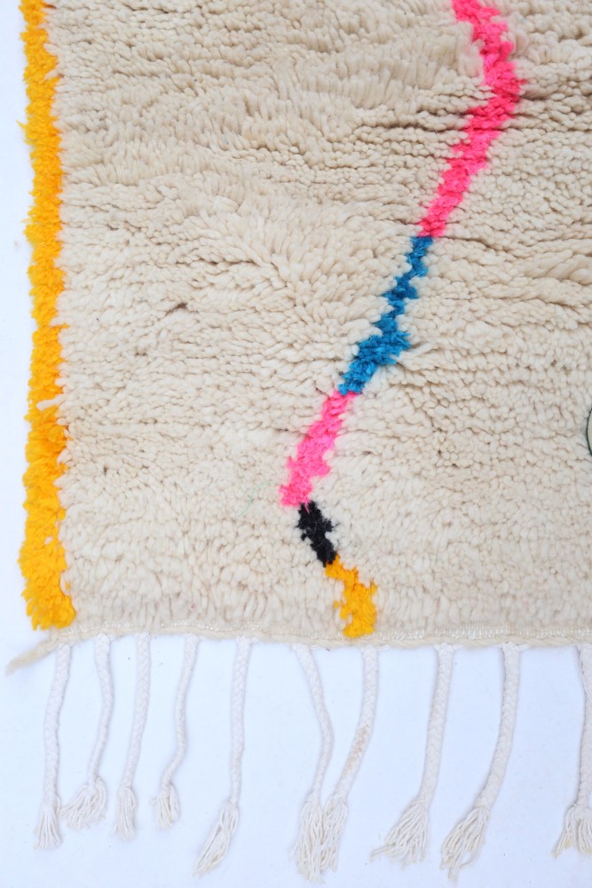This Berber carpet called Azilal gets its name from the Azilal region in Morocco where it was handcrafted on a traditional wooden loom. Its patterns represent the weaver’s moods, loves, and sorrows at the time of creation. Once this colorful Berber carpet is created, she will make another one entirely different, based on her current emotions. Each piece is therefore unique.
