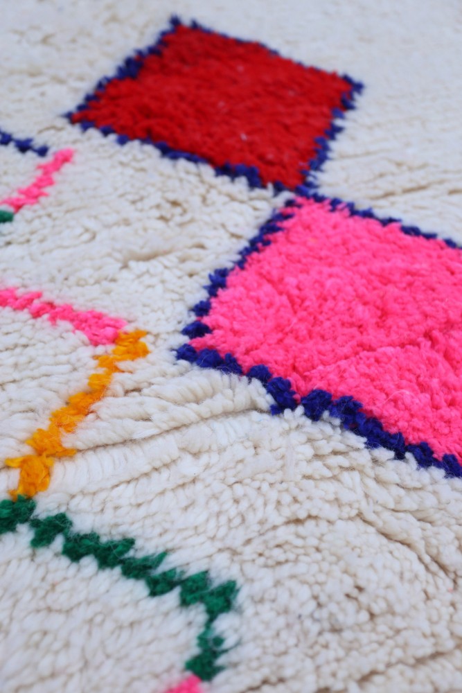 This Berber carpet called Azilal gets its name from the Azilal region in Morocco where it was handcrafted on a traditional wooden loom. Its patterns represent the weaver’s moods, loves, and sorrows at the time of creation. Once this colorful Berber carpet is created, she will make another one entirely different, based on her current emotions. Each piece is therefore unique.