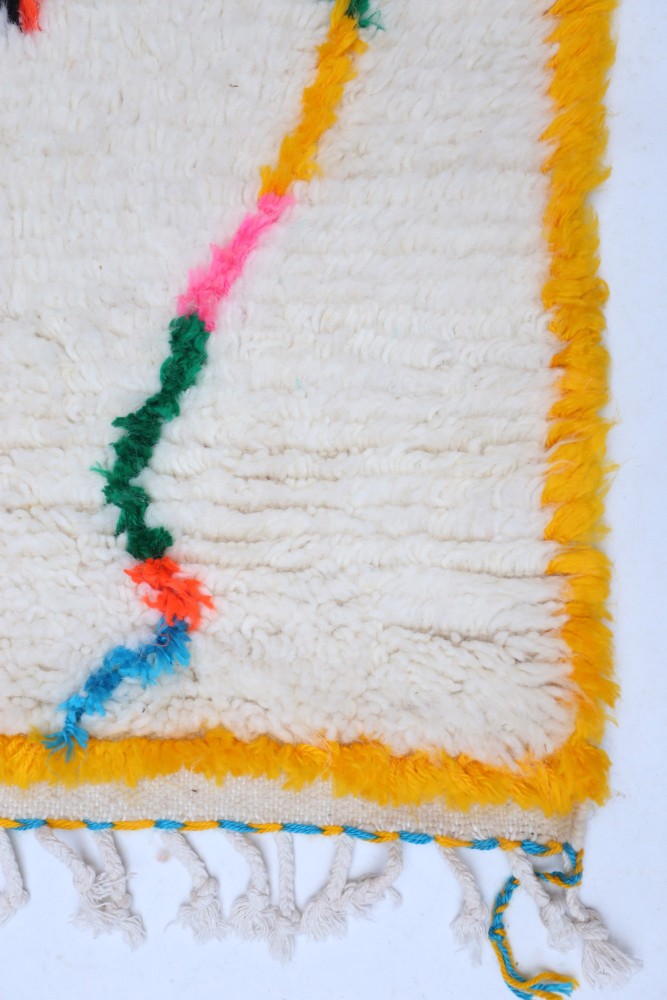 This Berber carpet called Azilal gets its name from the Azilal region in Morocco where it was handcrafted on a traditional wooden loom. Its patterns represent the weaver’s moods, loves, and sorrows at the time of creation. Once this colorful Berber carpet is created, she will make another one entirely different, based on her current emotions. Each piece is therefore unique.