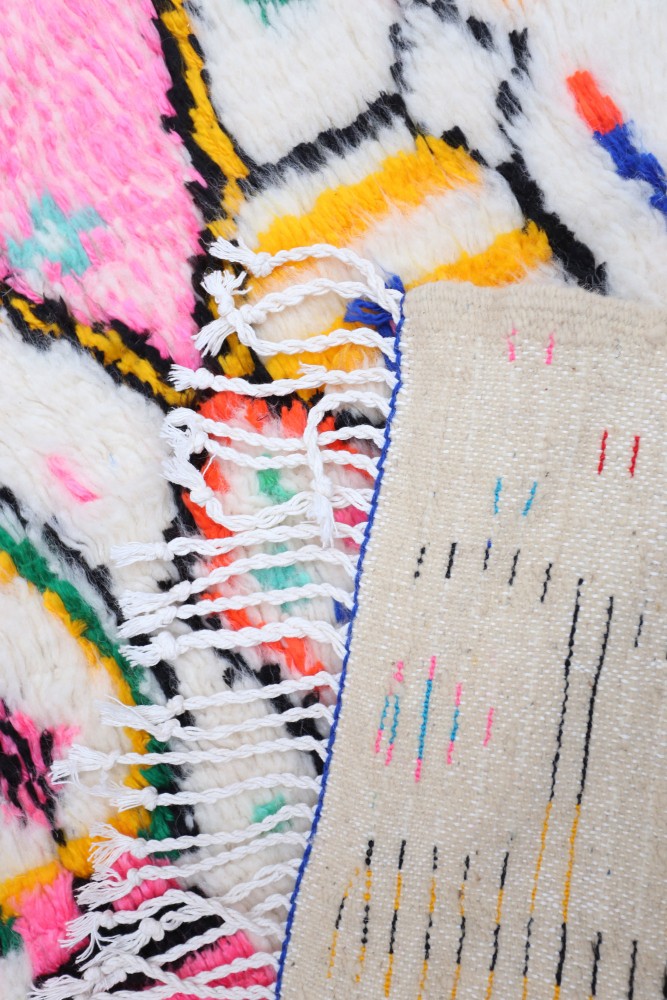 This Berber carpet called Azilal gets its name from the Azilal region in Morocco where it was handcrafted on a traditional wooden loom. Its patterns represent the weaver’s moods, loves, and sorrows at the time of creation. Once this colorful Berber carpet is created, she will make another one entirely different, based on her current emotions. Each piece is therefore unique.