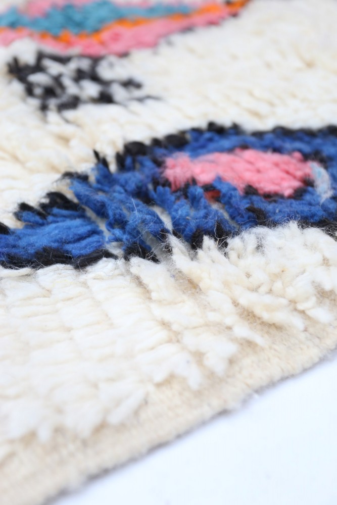 This Berber carpet called Azilal gets its name from the Azilal region in Morocco where it was handcrafted on a traditional wooden loom. Its patterns represent the weaver’s moods, loves, and sorrows at the time of creation. Once this colorful Berber carpet is created, she will make another one entirely different, based on her current emotions. Each piece is therefore unique.