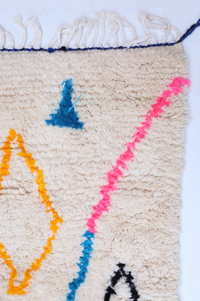 This Berber carpet called Azilal gets its name from the Azilal region in Morocco where it was handcrafted on a traditional wooden loom. Its patterns represent the weaver’s moods, loves, and sorrows at the time of creation. Once this colorful Berber carpet is created, she will make another one entirely different, based on her current emotions. Each piece is therefore unique.