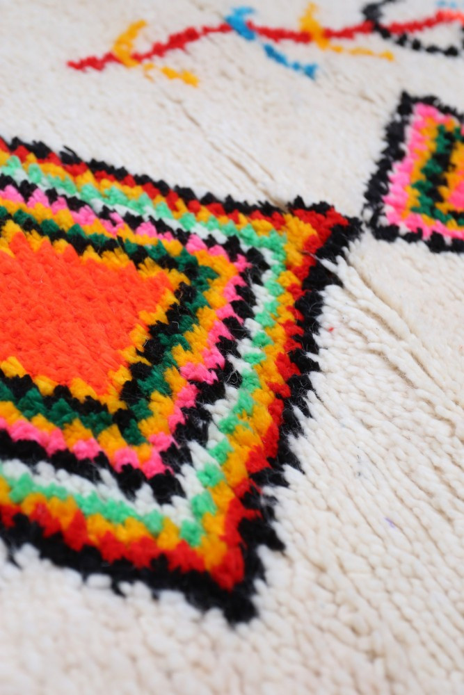 This Berber rug called Azilal gets its name from the Azilal region in Morocco where it was handcrafted on a traditional wooden loom. Its patterns represent the moods, loves, and sorrows of the weaver at the time of its creation. Once this colorful Berber rug is created, she will craft another one completely different, based on her emotions of the moment. Each piece is therefore unique.