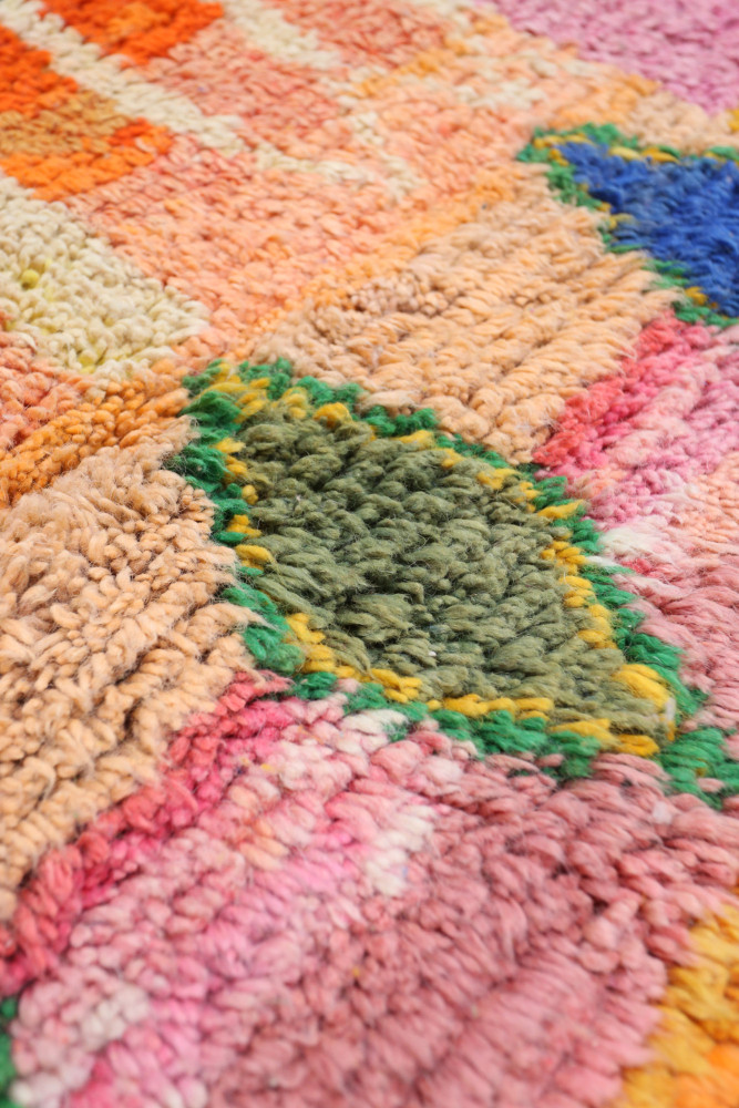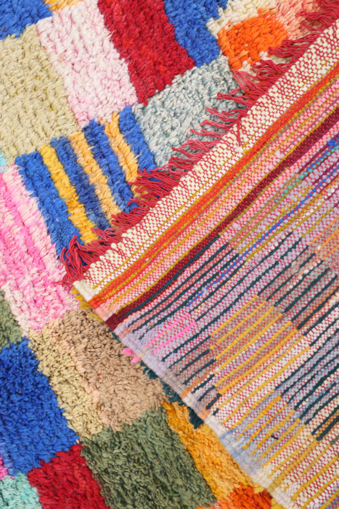 This Berber carpet called Azilal gets its name from the Azilal region in Morocco where it was handcrafted on a traditional wooden loom. Its patterns represent the weaver’s moods, loves, and sorrows at the time of creation. Once this colorful Berber carpet is created, she will make another one entirely different, based on her current emotions. Each piece is therefore unique.