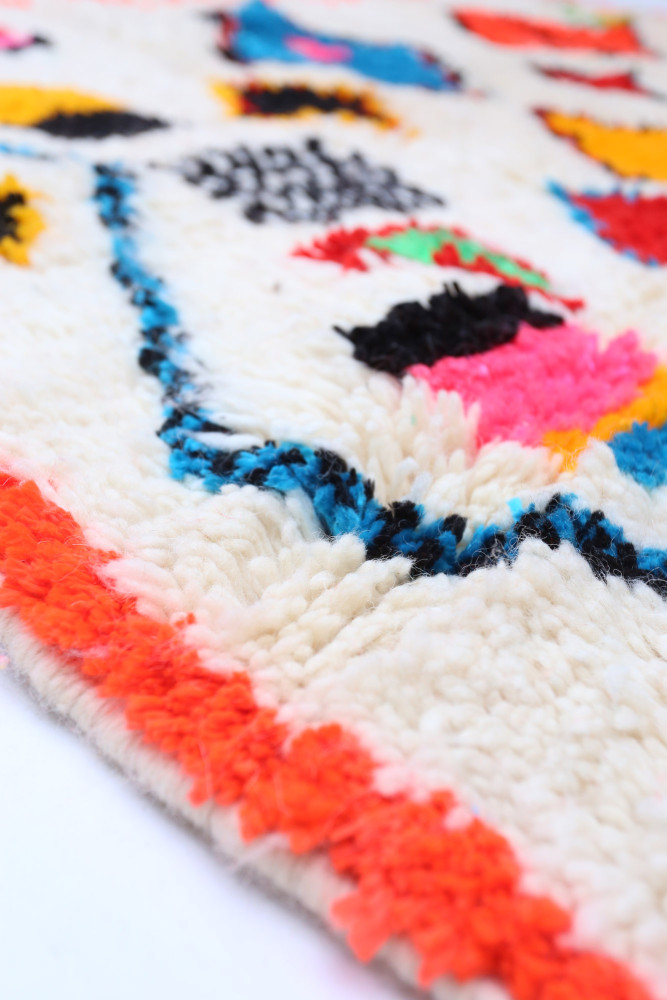 This Berber carpet called Azilal gets its name from the Azilal region in Morocco where it was handcrafted on a traditional wooden loom. Its patterns represent the weaver’s moods, loves, and sorrows at the time of creation. Once this colorful Berber carpet is created, she will make another one entirely different, based on her current emotions. Each piece is therefore unique.