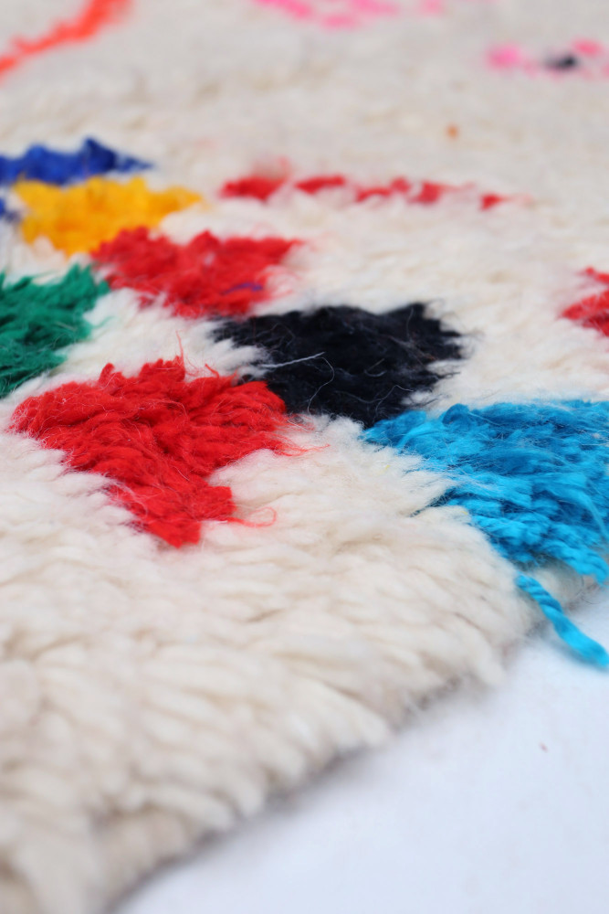 This Berber carpet called Azilal gets its name from the Azilal region in Morocco where it was handcrafted on a traditional wooden loom. Its patterns represent the weaver’s moods, loves, and sorrows at the time of creation. Once this colorful Berber carpet is created, she will make another one entirely different, based on her current emotions. Each piece is therefore unique.