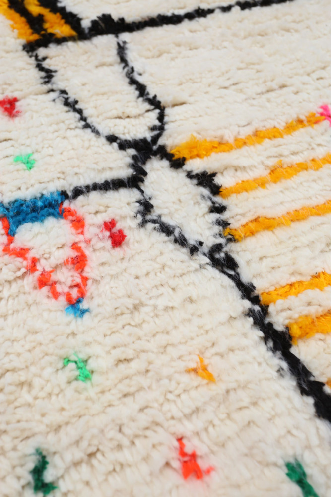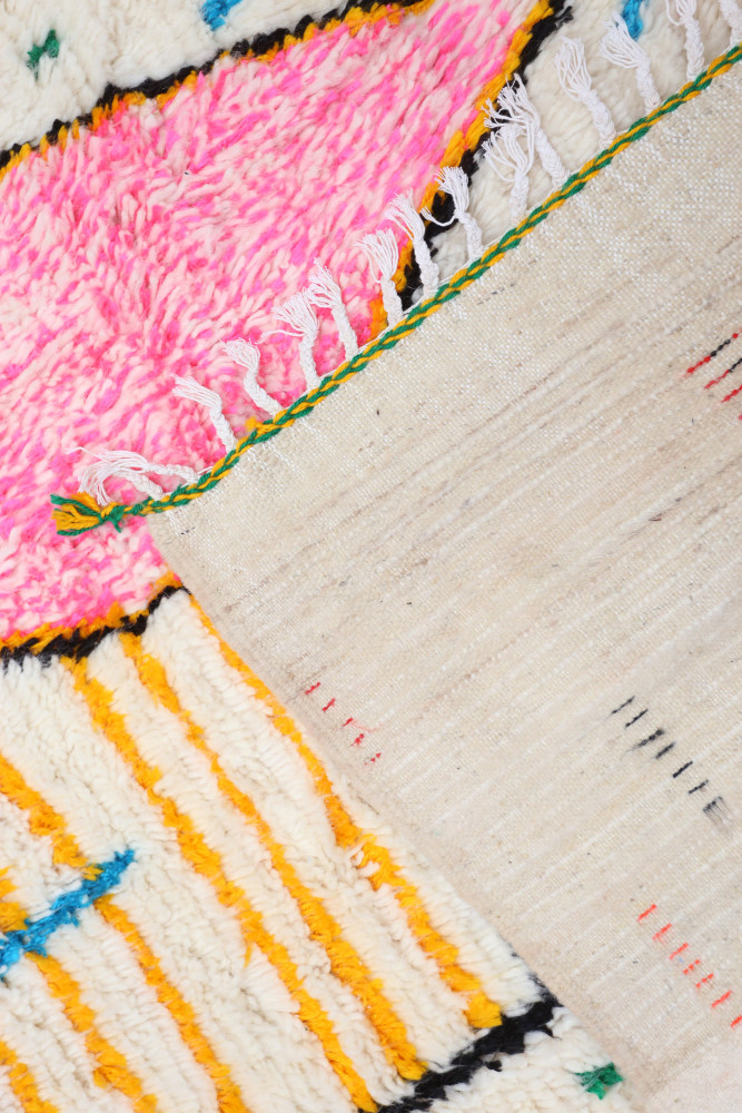 This Berber carpet called Azilal gets its name from the Azilal region in Morocco where it was handcrafted on a traditional wooden loom. Its patterns represent the weaver’s moods, loves, and sorrows at the time of creation. Once this colorful Berber carpet is created, she will make another one entirely different, based on her current emotions. Each piece is therefore unique.
