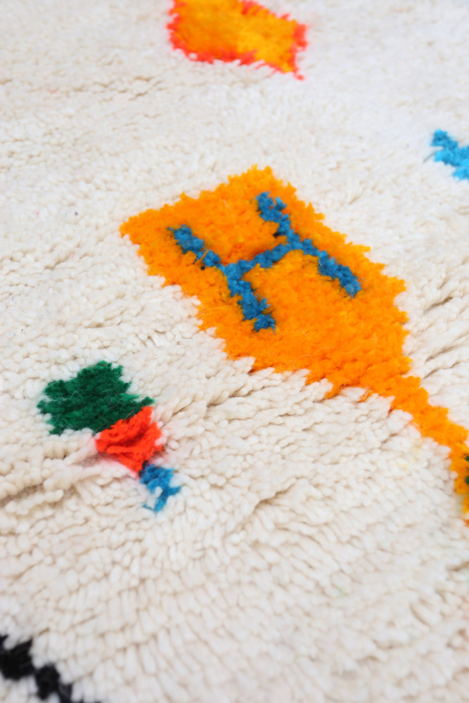 This Berber carpet called Azilal gets its name from the Azilal region in Morocco where it was handcrafted on a traditional wooden loom. Its patterns represent the weaver’s moods, loves, and sorrows at the time of creation. Once this colorful Berber carpet is created, she will make another one entirely different, based on her current emotions. Each piece is therefore unique.
