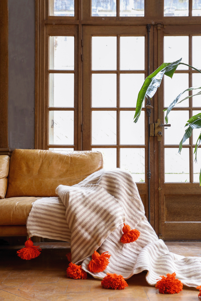 Berber plaid with taupe striped pompons -