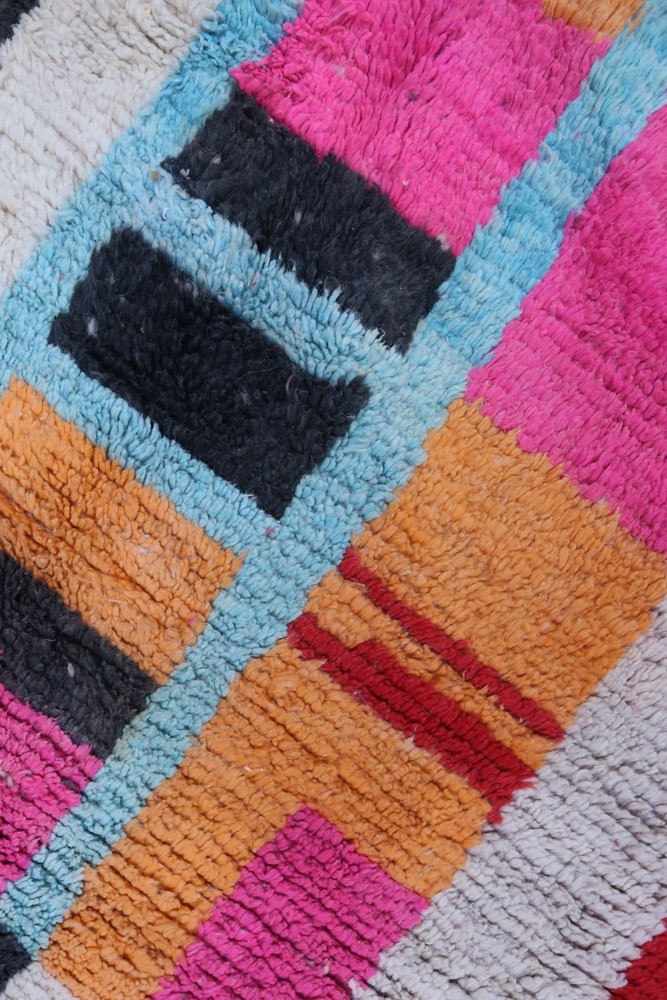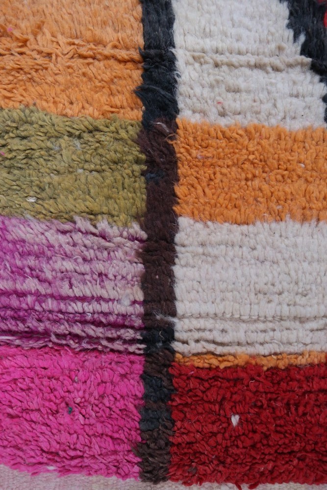 This Berber carpet called Azilal gets its name from the Azilal region in Morocco where it was handcrafted on a traditional wooden loom. Its patterns represent the weaver’s moods, loves, and sorrows at the time of creation. Once this colorful Berber carpet is created, she will make another one entirely different, based on her current emotions. Each piece is therefore unique.