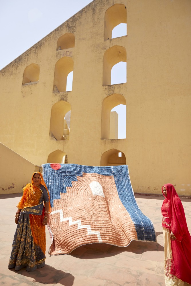 This bedspread was designed in Los Angeles and handcrafted in India, requiring the expertise of four artisans: wood carvers, printers, seamstresses, and dyers. The pattern is printed using hand-carved wooden blocks dipped in dyes.