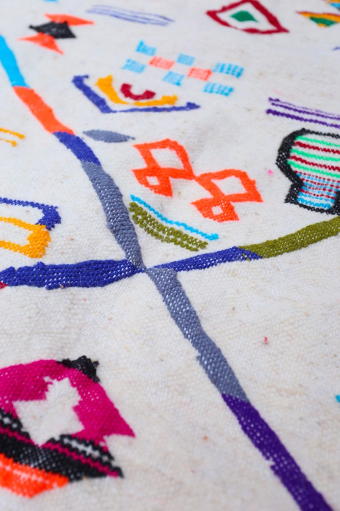 This Berber carpet called Azilal gets its name from the Azilal region in Morocco where it was handcrafted on a traditional wooden loom. Its patterns represent the weaver’s moods, loves, and sorrows at the time of creation. Once this colorful Berber carpet is created, she will make another one entirely different, based on her current emotions. Each piece is therefore unique.