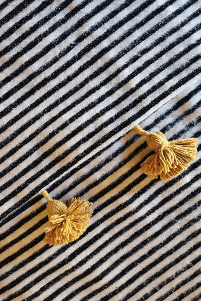 Manta bereber con borlas negras y blancas.