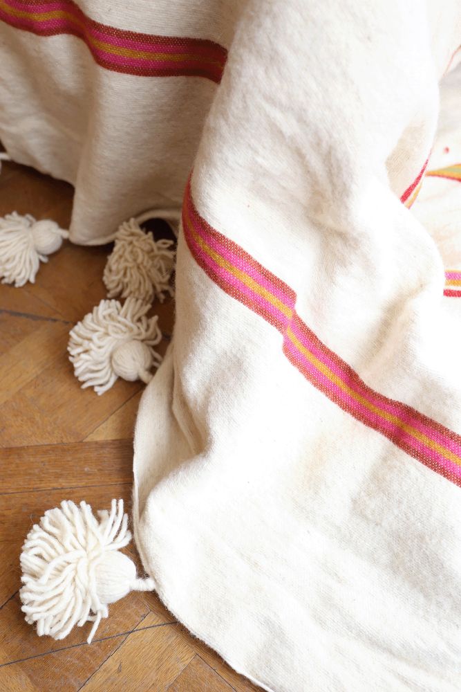 Manta bereber con pompones blancos y rayas rosas.