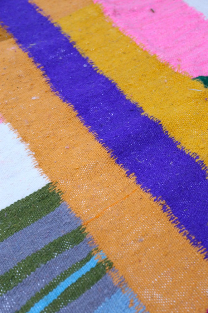 Lo alfombra Boucherouite Es confeccionado por mujeres que recogen telas, prendas rotas, restos de lana y trapos. Con estos materiales reciclados, pueden crear alfombras éticas y duraderas. Expresan sus emociones, amores y penas en la elección de colores y patrones. ¡La alfombra bereber azul de la tribu Boucherouite puede realzar la decoración de tu habitación al mismo tiempo que haces una elección de decoración ecológica !